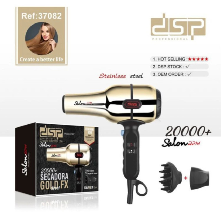 برند دی اس پی یکی از برند های بسیار با کیفیت و جا افتاده چینی هست که پرچم دار در محصولات زیبایی و سالنی می باشد. یکی از بهترین محصولات شرکت DSP، سشوار سالنی DSP 37082 بدنه تمام استیل دو لایه و عایق است. که با توانی معادل 2000 وات واقعی نیاز هر فرد و آرایشگری را به سشوار با توجه به حرارت بالا و پرتاب باد عالی اش براآورده می نماید.
